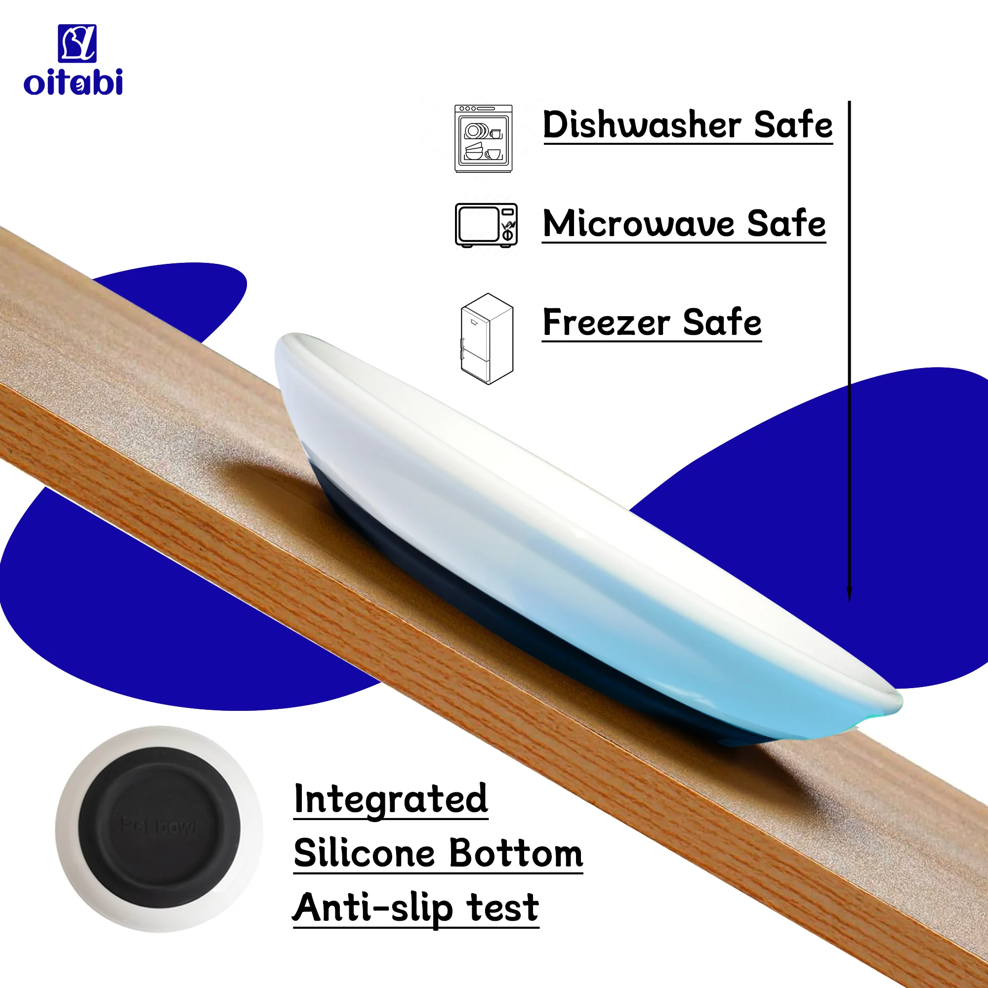 【No Slide, No Clank Noise】: To prevent slidding, we designed a integrated silicone base, ensures that the food bowl will not tip over or move easily during feeding time. Besides, the silicone base can protect your floors, and reduces the noise from clanking.